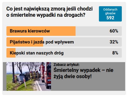 Ostatnio pytaliśmy co jest największą zmorą jeśli chodzi o śmiertelne wypadki na drogach? W głosowaniu wzięły udział 592 osoby. 60% ankietowanych wskazało, że jest to brawura kierowców.