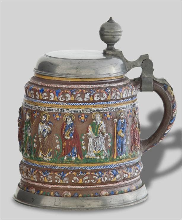 Kufel z apostołami, Kraussen (?), Niemcy, 2 poł. XVII w., kamionka, nakładki, farby emaliowe, cyna, 20x15 cm