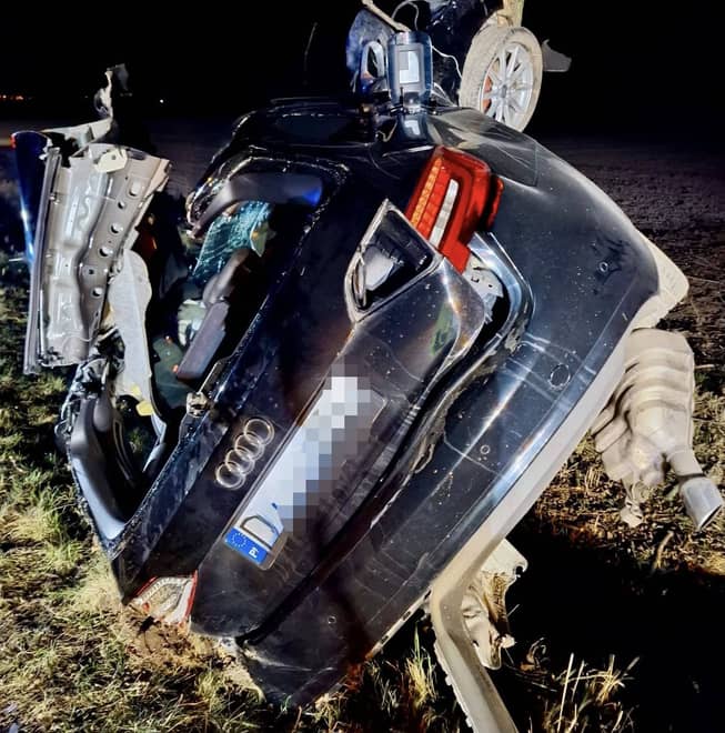 Ku przestrodze: noc + prędkość + możliwe promile + brak pasów = tragiczne skutki. Nie ryzykuj życiem – swoim i innych - alarmują funkcjonariusze policji.