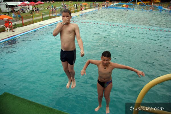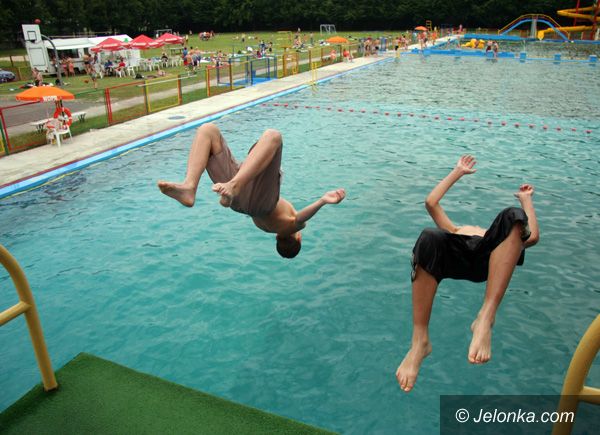 Odważni jako pierwsi zdecydowali się na skok z wieży do niezbyt jeszcze ciepłej wody kąpieliska.