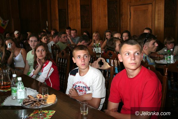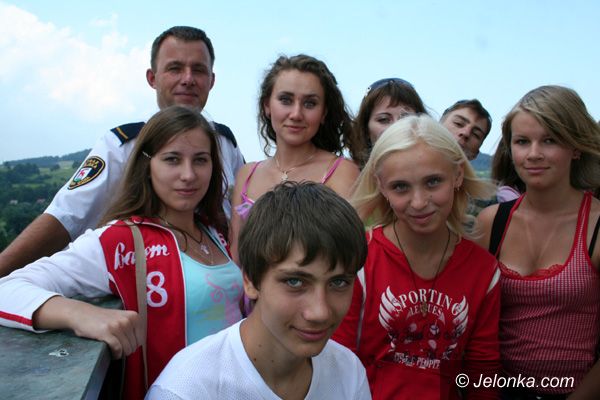 Młodzież z Charkowa i Bedryczowa na tarasach wieży magistratu z mł. insp. Grzegorzem Rybarczykiem.