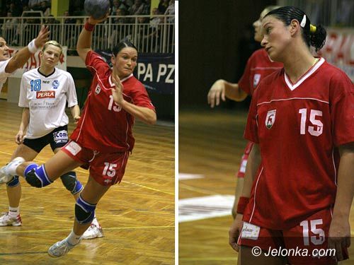 Efektowny rzut skrzydłowej Doroty Czekaj (Jelfa). Reprezentacyjna bramkarka - Magdalena Chemicz (SPR)