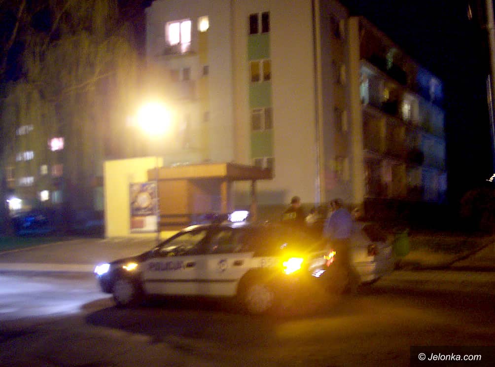 Radiowóz policyjny i funkcjonariusze podczas zatrzymania sprawcy.