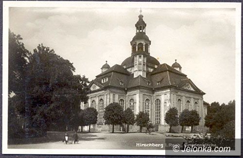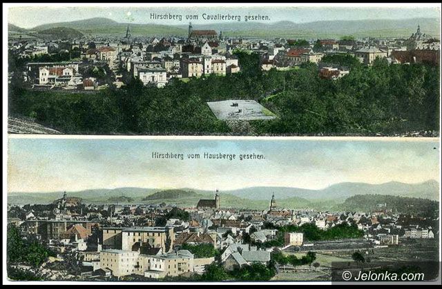 Kościół Łaski to z lewej, to z prawej: panoramy Jeleniej Góry z przeciwległych wzgórz: Hausbergu i Kavalierbergu (Krzywoustego i Kościuszki).