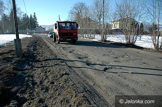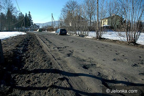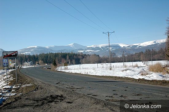 Piękne Karkonosze, a na pierwszym planie podziurawiona nawierzchnia szosy.