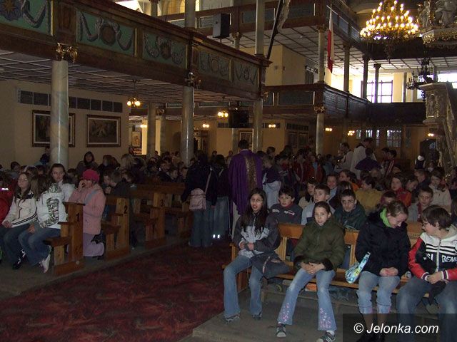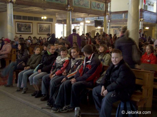 Uczniowie słuchają nauk rekolekcyjnych w kościele pw. Podwyższenia Krzyża Świętego.