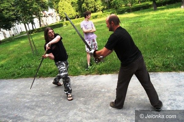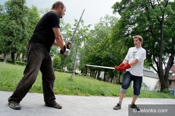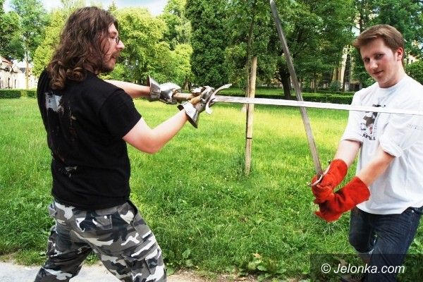 Trenują walkę na miecze. Pod Kościołem Łaski