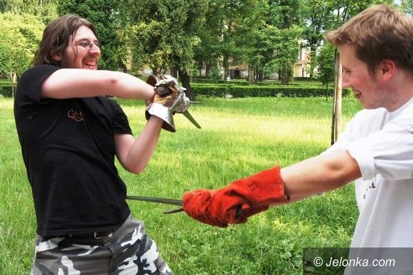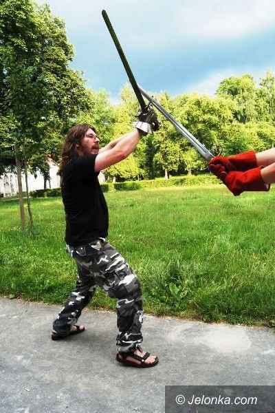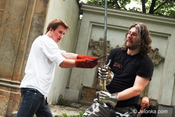 Trenują walkę na miecze. Pod Kościołem Łaski